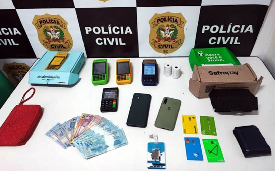Na oportunidade, foram localizadas, no interior do veículo, em uma sacola preta, 4 máquinas de cartão de crédito, 3 cartões de crédito de diferentes pessoas, 1 caderneta de poupança, dinheiro em espécie, 1 crachá falso e as vestes utilizadas nos crimes.