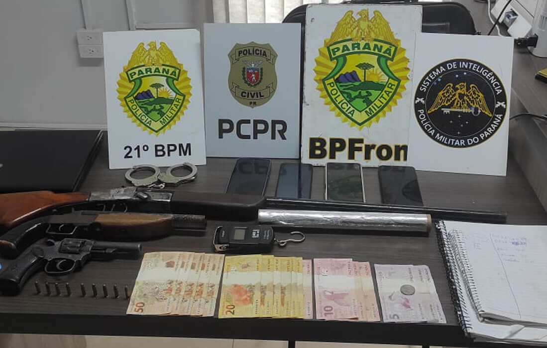 Foram ainda apreendidas 3 armas de fogo 01 revólver calibre 22; 01 garrucha calibre 36; 01 espingarda calibre .20; 14 celulares; 01 notebook; 05 buchas cocaína; 01 balança de precisão; R$ 455,50 apreendido.