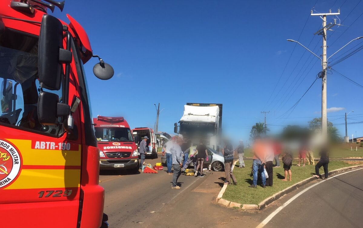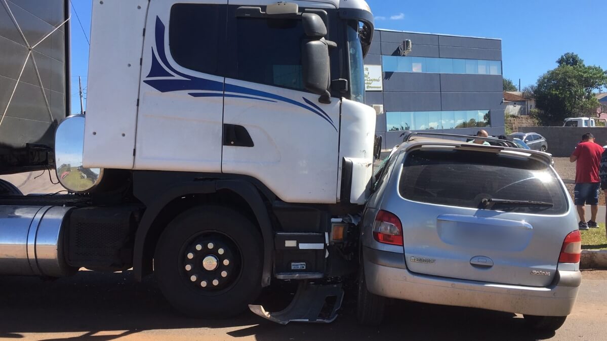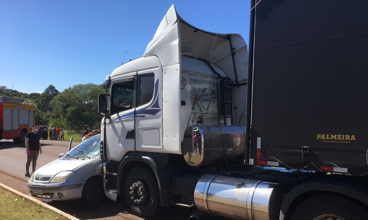 No local houve um acidente do tipo colisão lateral envolvendo um veículo Renault Scenic, de Santo Antonio do Sudoeste/PR, e um caminhão Scania.