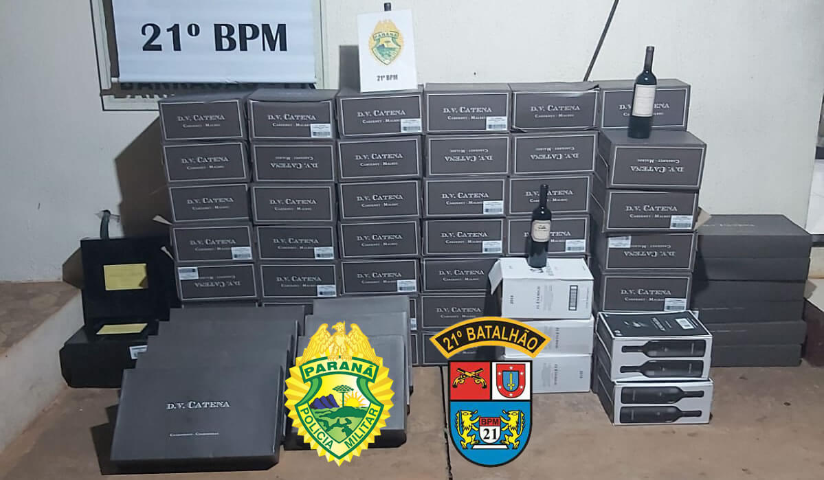Realizada vistoria, foi constatado que os mesmos estavam chaveados, porém foi possível visualizar caixas de vinhos Argentinos no interior de ambos os veículos, sendo que a carga estava coberta grande parte com panos pretos.