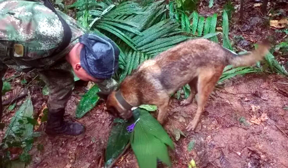 As Forças Armadas colombianas, à frente das buscas em mata fechada e sob intensas chuvas, divulgaram que a orientação de um cachorro, de nome Ulises, ajudou a encontrar um abrigo improvisado, o que sinalizou a presença das crianças resgatadas.