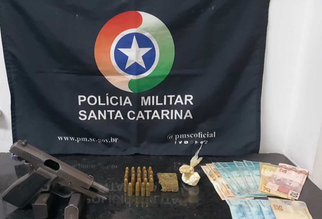 Após a abordagem, durante revista pessoal, foi localizado em sua cintura uma pistola 9mm de fabricação Argentina e dois carregadores com doze munições cada, bem como substâncias entorpecentes, maconha e cocaína.