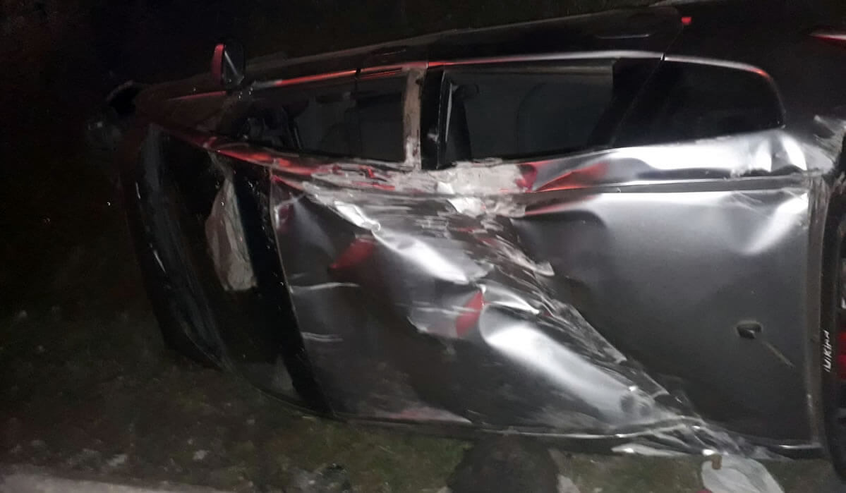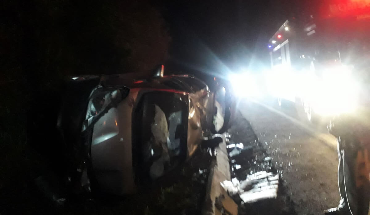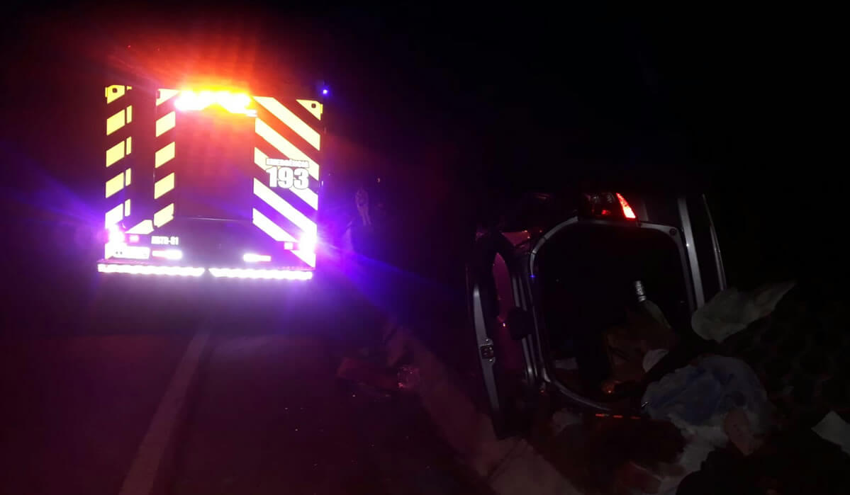 No local houve um acidente do tipo saída de pista seguido de capotamento, de um veículo Honda City, placas de Caçador/SC, ocupado por cinco pessoas, sendo 4 maiores e um bebê.