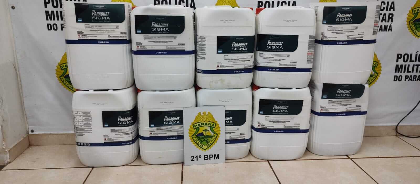 Em vistoria no local, foi constatado que o veículo estava carregado com 6 galões de Agrotóxico da marca Sigma Paraquat proveniente da Argentina e com venda proibida no Brasil.