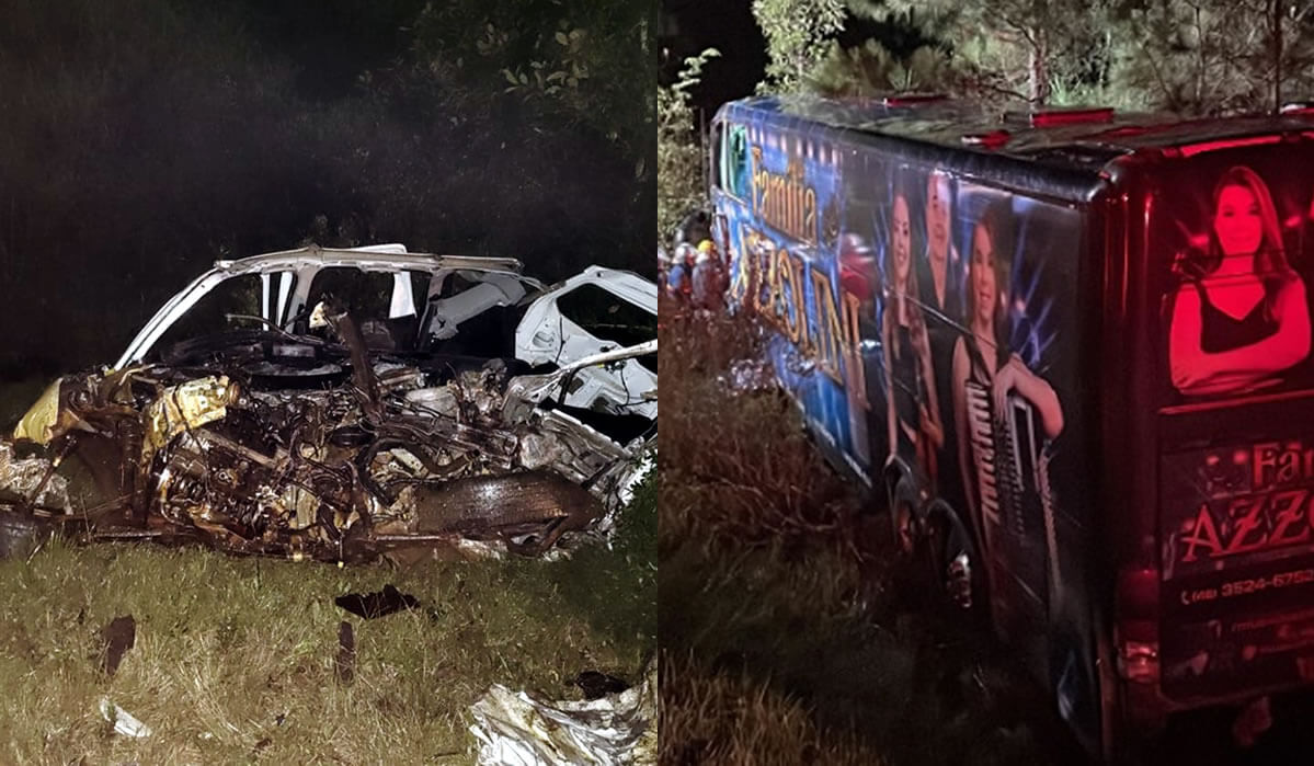 Um grave acidente entre um carro e o ônibus da Banda Família Azzolini deixou duas pessoas mortas em Clevelândia, no Sudoeste do Paraná.