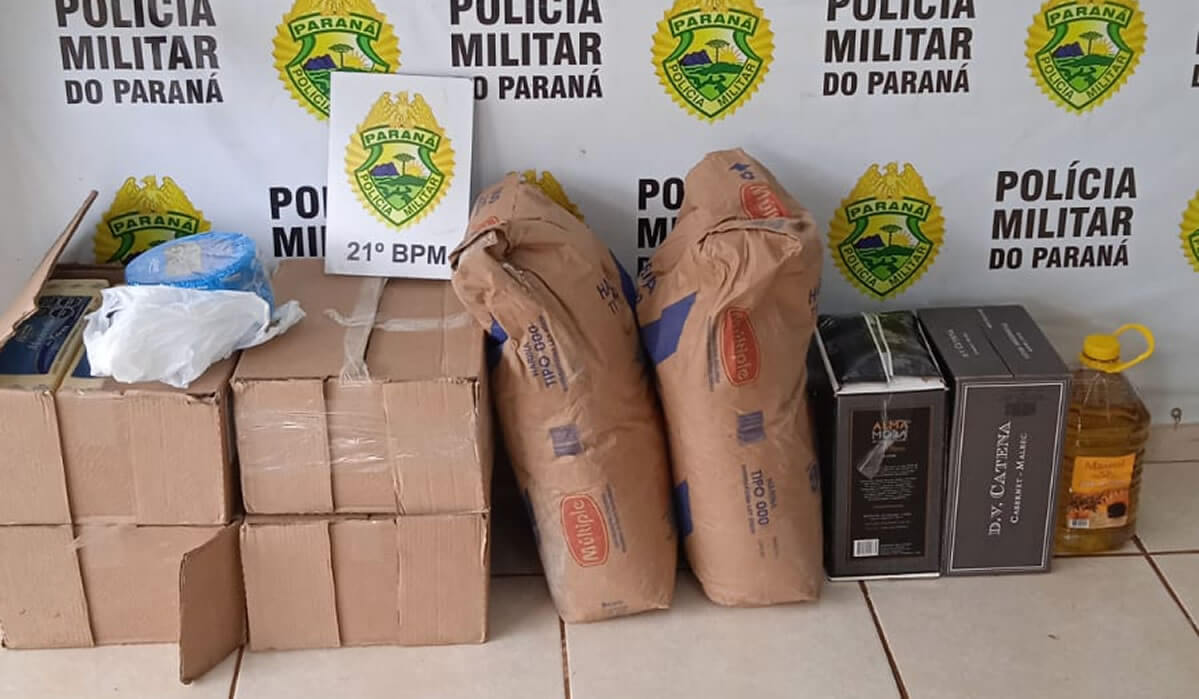 Em revista, foi localizado no porta-malas do carro, 26 peças de queijos, totalizando 86 kg, 08 garrafas de vinho, 02 pacotes de farinha trigo de 25 kg cada, 06 garrafas de Campari, produtos de origem Argentina sem legalização aduaneira.
