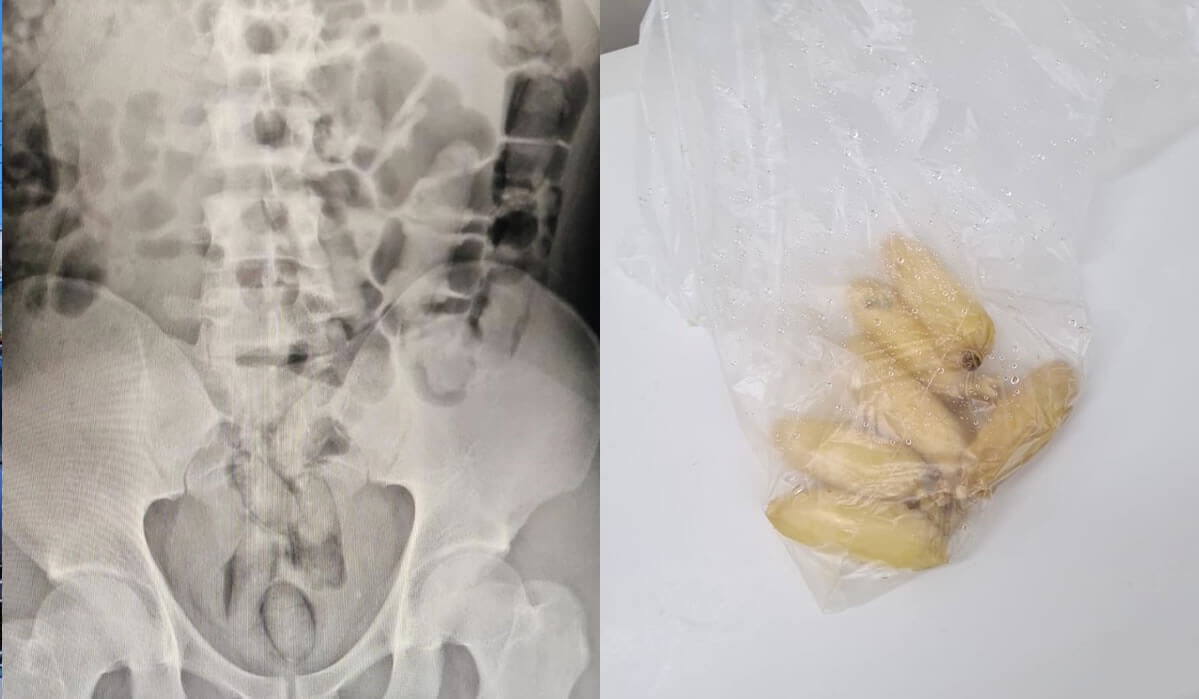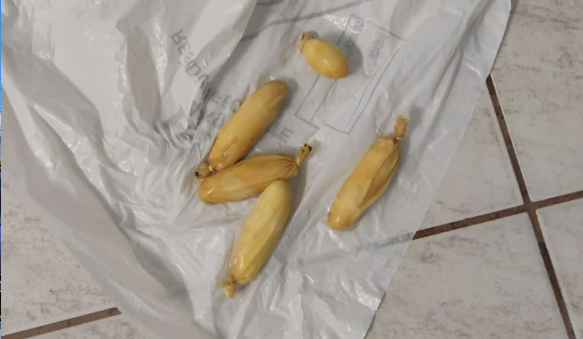 O suspeito foi encaminhado ao hospital onde foi realizado exame de raio X, que confirmou a existência de aproximadamente 29 cápsulas contendo, segundo o homem, cocaína.
