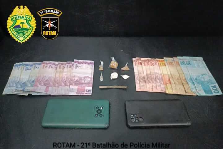 Na casa os policiais localizaram 1 grama de maconha, 10 gramas de crack, 4 gramas de cocaína, dois celulares e R$ 555,00.