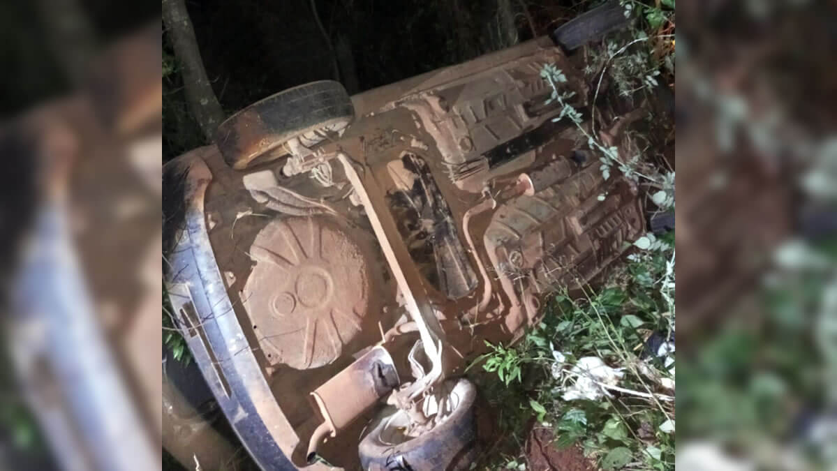 No local houve um acidente do tipo saída de pista seguida de capotamento, sendo que o veículo estava lateralizado apoiado em duas arvores no barranco a cerca de 20 metros da margem da via.