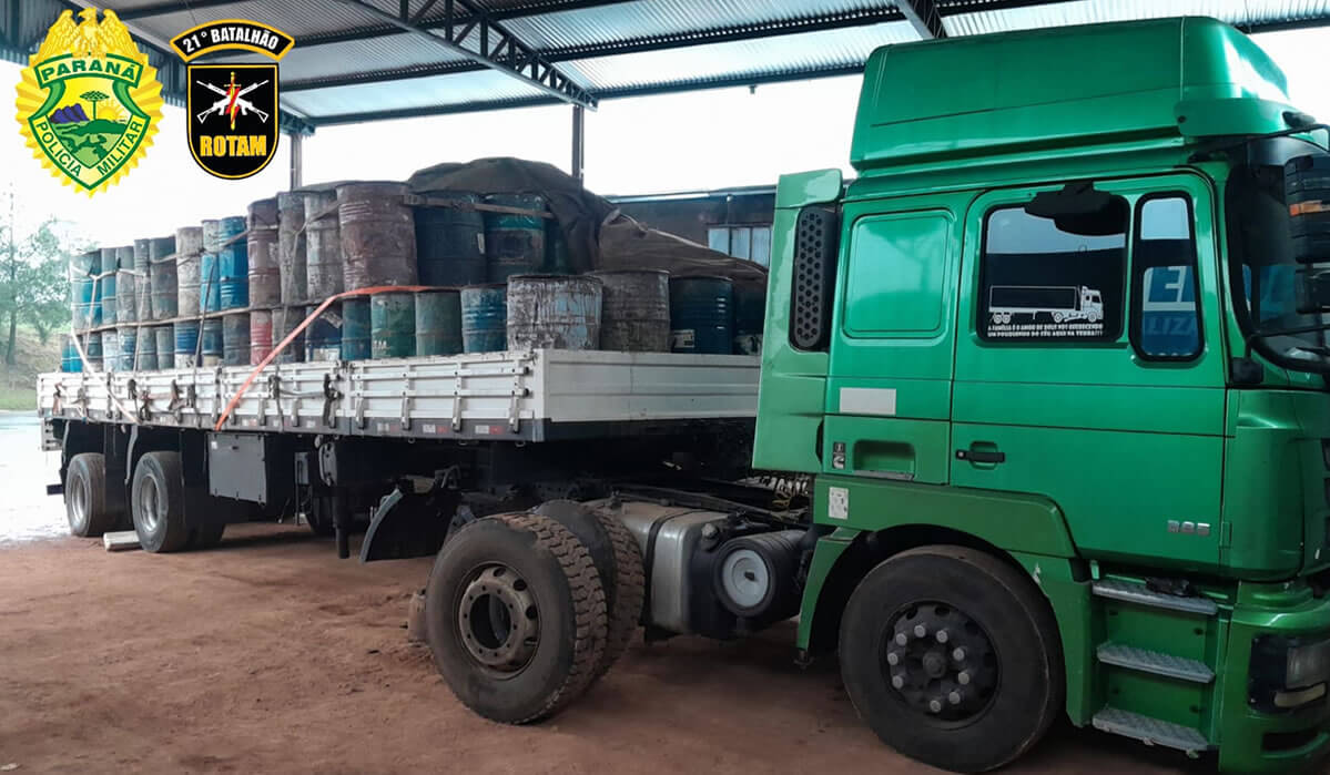 Equipes iniciaram diligências, momento que foi logrado êxito em encontrar a carreta, sendo identificado o motorista de 31 anos, que disse ser proprietário do veículo e informou que o caminhão estava carregado com 124 tambores de aproximadamente 200 kg cada, de resina de pinus.