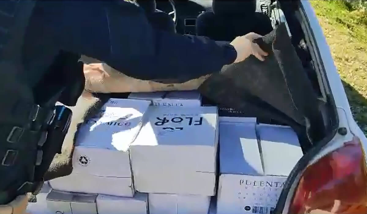 Após abordagem foi identificado o motorista, um homem de 28 anos. Em revista, foi localizado no porta-malas e nos bancos do veículo grande quantidade de caixas de vinho.