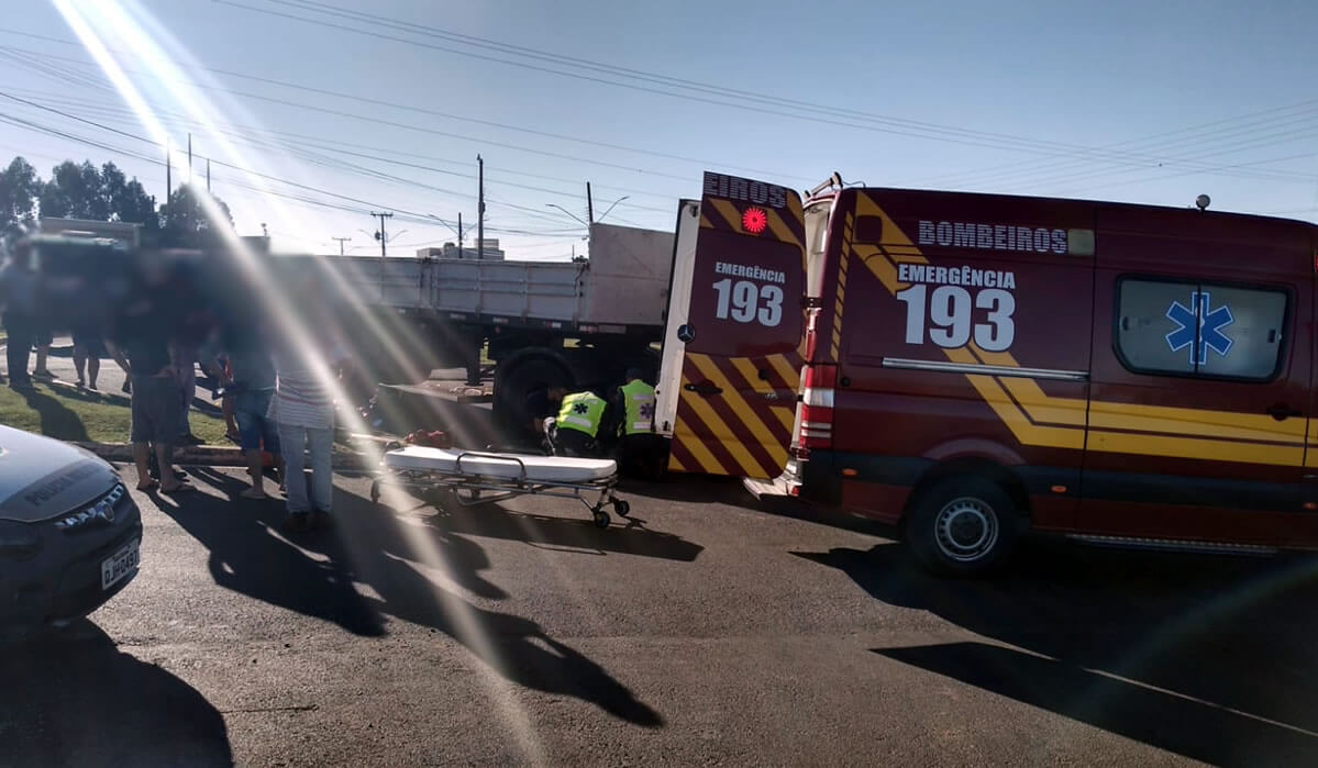 No local houve um acidente do tipo colisão lateral envolvendo uma motocicleta e um caminhão.