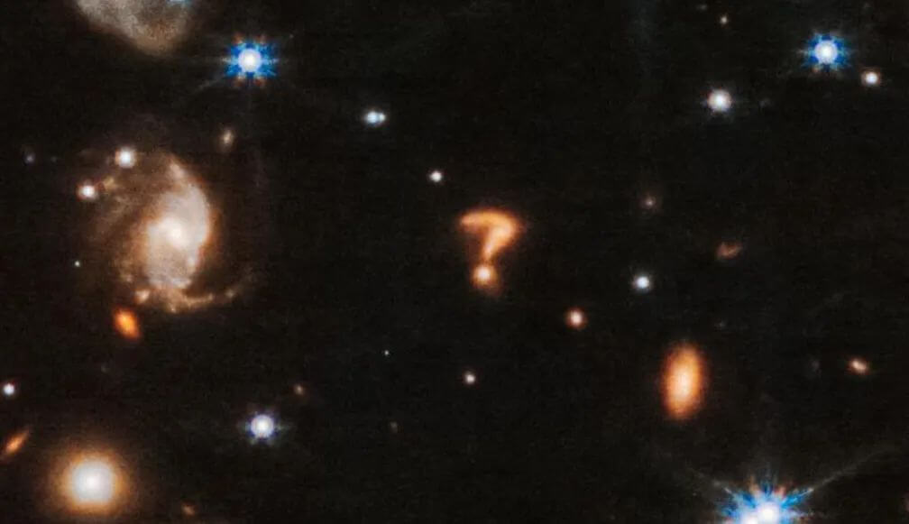 Uma das principais dicas apontadas pelos astrônomos para isso é a cor do ponto de interrogação. A tonalidade mais avermelhada indica que o objeto está bastante afastado e lembra outras galáxias do espaço profundo detectadas no último ano pelas câmeras do supertelescópio.