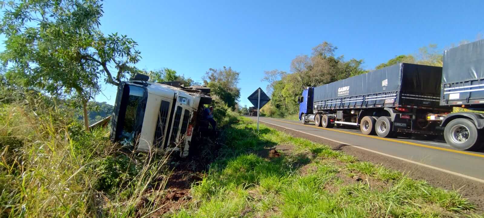 No local houve um acidente do tipo saída de pista seguido de tombamento de uma carreta Volvo, placas de São Sepé/RS, carregada com arroz com casca.