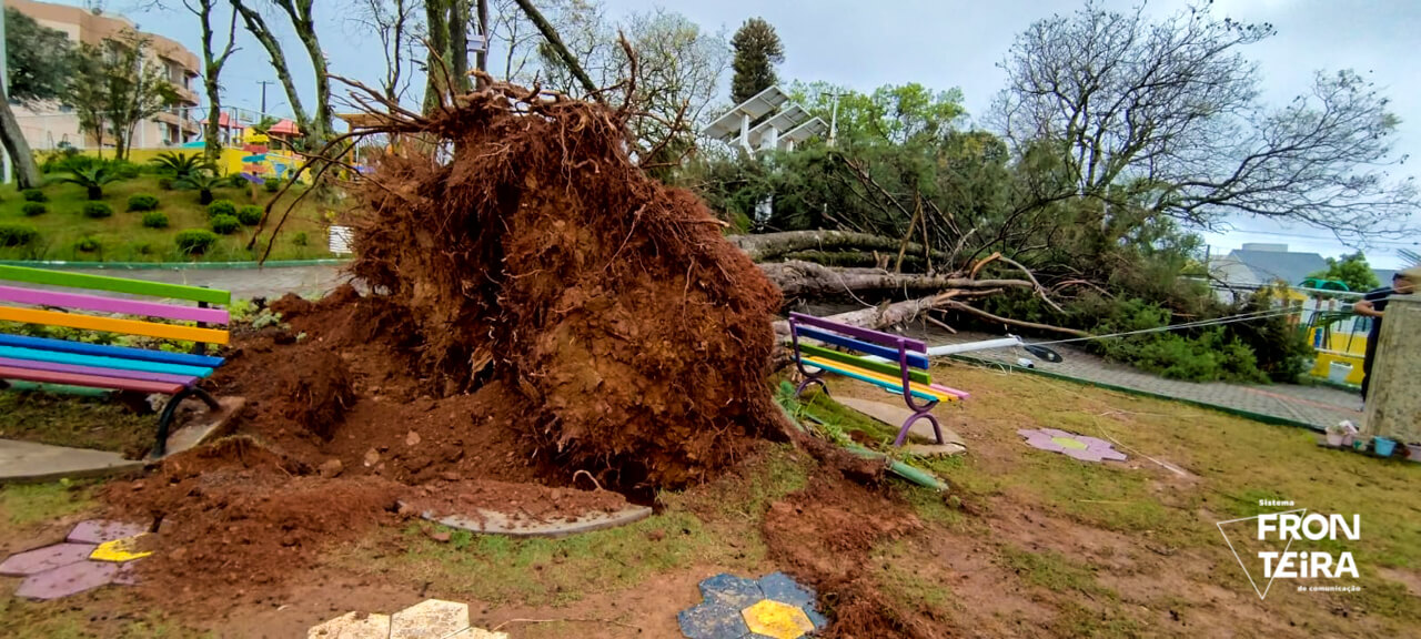 A Praça Municipal de Dionísio Cerqueira foi um dos pontos que sofreram danos com a tempestade. Três árvores foram arrancadas com a força do vento.