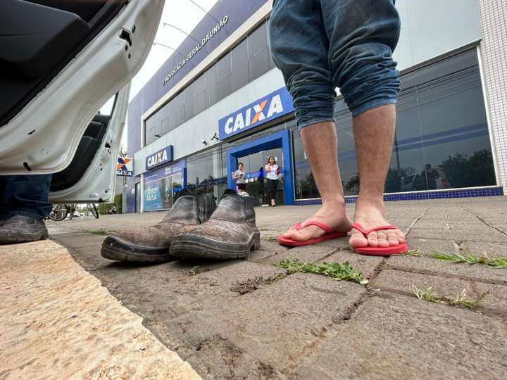 Ele teve que trocar sua botina pelo chinelo da mãe para poder entrar na agência, passando por uma situação de constrangimento.