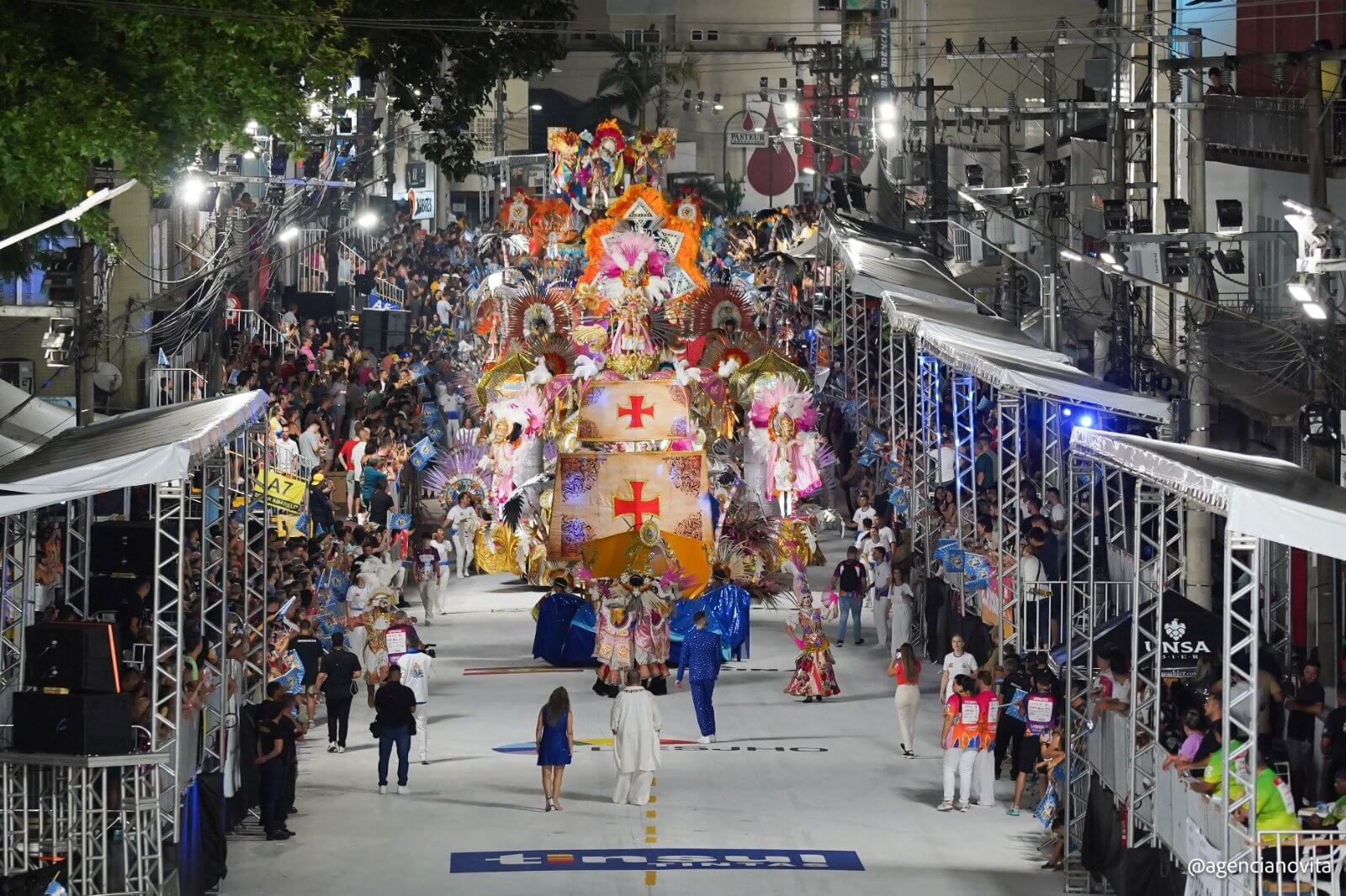 Por fim, a Acadêmicos do Grande Vale fechou a noite com o enredo “50 anos do Tejo”, uma emocionante narrativa que retratou a trajetória do Teatro Tejo, precursor cultural que desempenhou um papel fundamental na formação da identidade da escola nos dias de hoje.
