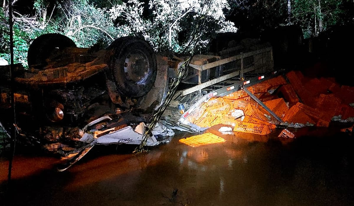 Segundo informações do Corpo de Bombeiros, a equipe foi acionada por volta das 02h10, para atendimento a uma ocorrência de acidente de trânsito, onde um caminhão carregado com frangos, despencou da ponte e capotou dentro do Rio Bonito.