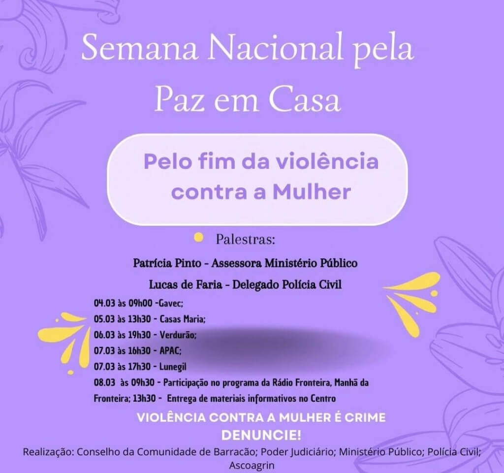 O Conselho da Comunidade de Barracão, Poder Judiciário, Ministério Público e Polícia Civil, estão realizando desde o último dia 4 de março a Semana Nacional pela Paz pelo fim da violência doméstica.
