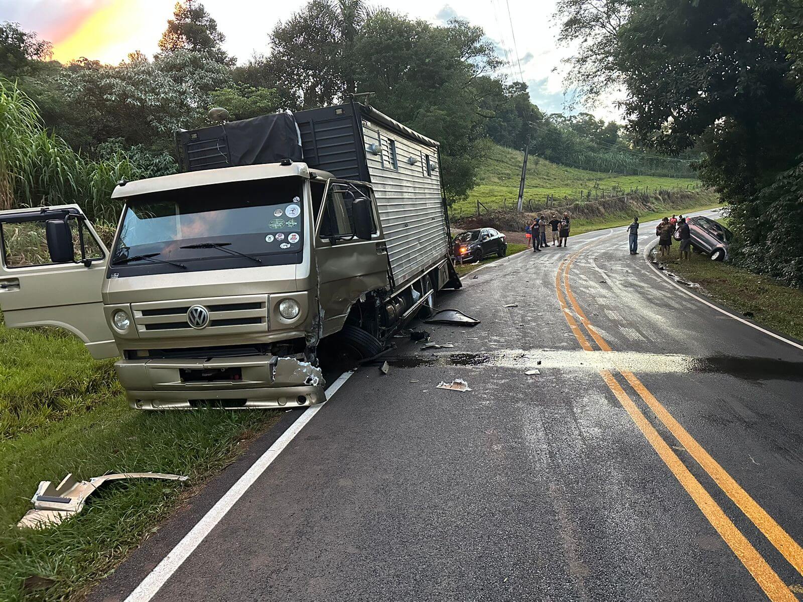 No local houve um acidente do tipo colisão frontal, envolvendo um veículo Ford Ka, conduzido por um homem de 32 anos e um Caminhão VW 7110, conduzido por um homem de 53 anos.