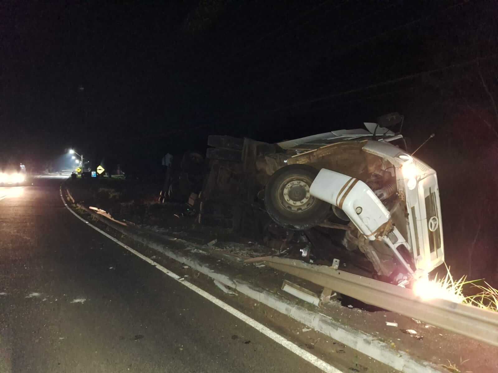 Caminhão sai da pista e tomba na SC-305 em Guaraciaba