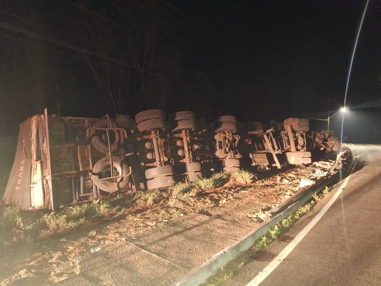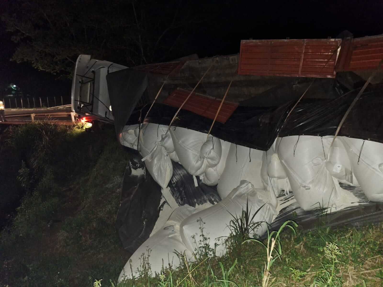 Segundo a Polícia Militar Rodoviária, o veículo com placas da Argentina apresentou falha mecânica no sistema de freios, que ocasionou o acidente. O caminhão tombou nas margens da rodovia e a carga de farinha ficou espalhada no local.