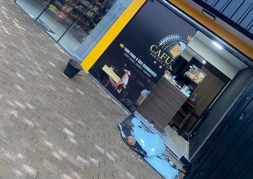 O meliante quebrou a porta da conveniência utilizando uma pedra.