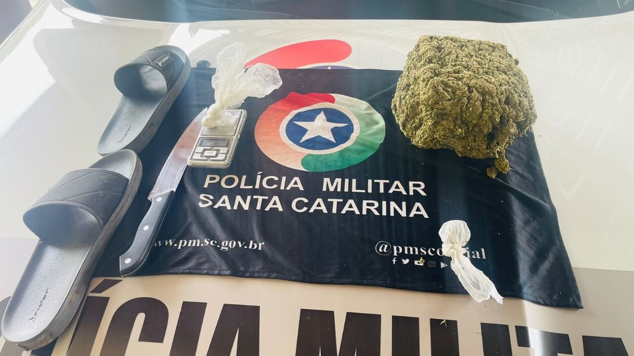 Ao chegarem ao local, os policiais avistaram um homem que deixou a casa com um objeto embrulhado em um pano. Na tentativa de abordá-lo, o suspeito fugiu em direção à mata, abandonando uma caixa e outros itens no caminho. A caixa continha aproximadamente 900 gramas de maconha, 5 gramas de cocaína, uma balança de precisão e uma faca de cozinha, evidenciando a prática de tráfico de drogas.