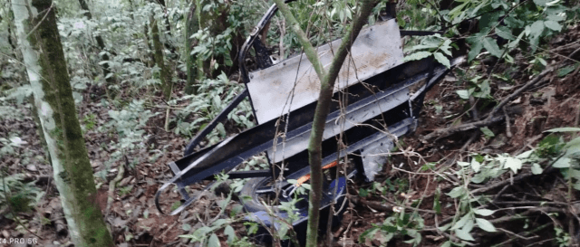 A guarnição foi acionada via Central de Operações (COPOM) para averiguar o encontro de objeto. No local, com o auxílio da vítima e de populares, os policiais localizaram o sidecar jogado em um penhasco.