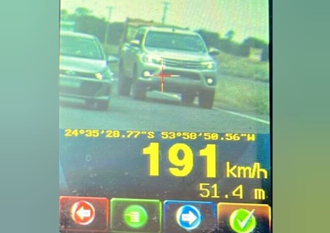 A Polícia Rodoviária Federal (PRF) flagrou um motorista de uma caminhonete transitando a 191 km/h durante fiscalização eletrônica de velocidade na BR-163, em Quatro Pontes, oeste do Paraná.