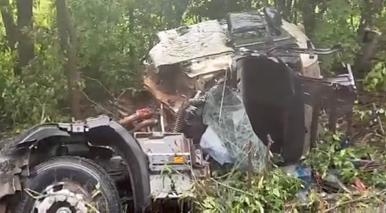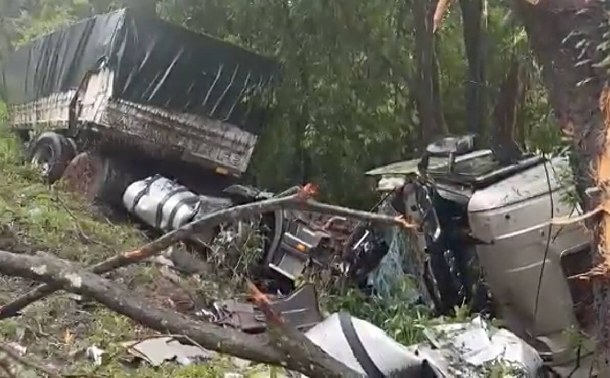 O caminhão saiu da pista e colidiu violentamente contra árvores às margens da rodovia, resultando na destruição completa da cabine.