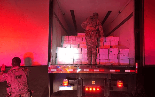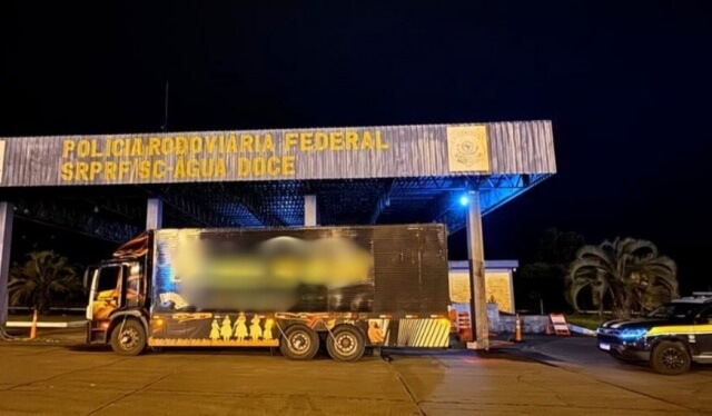 Na madrugada desta quinta-feira (9), policiais rodoviários federais apreenderam cerca de 8 mil quilos de camarão contrabandeado da Argentina na BR-153, em Água Doce.
