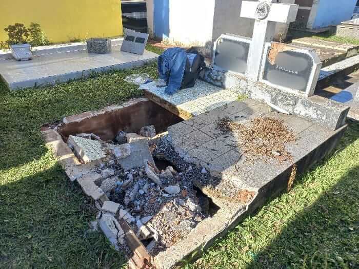 Por volta das 7h30, o responsável pela manutenção do local realizava a ronda diária quando percebeu sacos de lixo sobre um túmulo aberto. Ao verificar o conteúdo, encontrou uma mochila com vários eletrônicos e acionou imediatamente a PM.