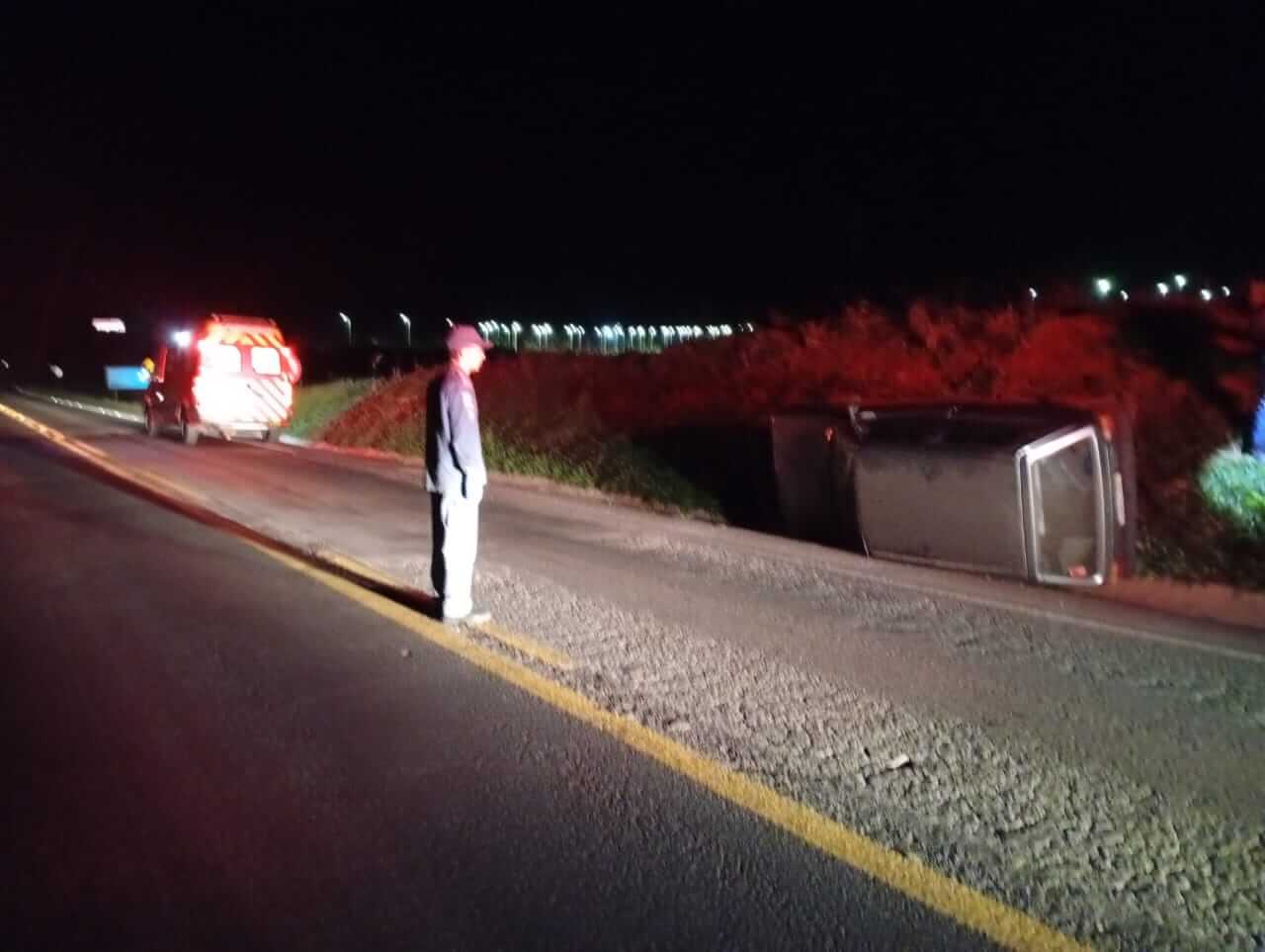 Ao chegar no local, a equipe encontrou um veículo lateralizado às margens da rodovia, sem ocupantes. O condutor foi localizado cerca de 100 metros à frente, sentado ao lado da pista.