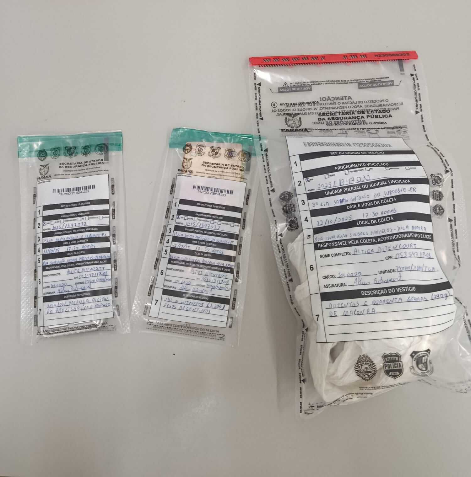 Na revista pessoal, foi encontrada com um deles duas porções de maconha. Um dos suspeitos fugiu pulando em um rio e não foi localizado. Durante buscas na residência, os policiais apreenderam mais 230 gramas de maconha escondidas no assoalho, uma balança de precisão e R$ 1.200 em pesos argentinos.