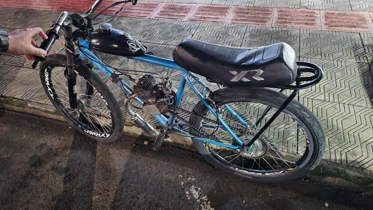 Ao verificar o veículo, a guarnição constatou que se tratava de um ciclomotor montado em quadro de bicicleta, equipado com motor 50cc a combustão e acelerador no punho. O veículo apresentava silenciador ineficiente, não possuía pedais auxiliares, espelhos, luzes e também não tinha registro junto ao Detran.