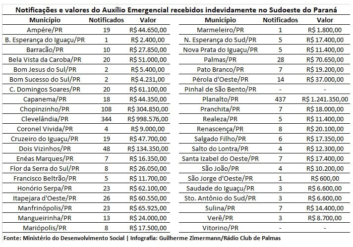 Quase 1,3 mil pessoas residentes no Sudoeste do Paraná estão sendo notificadas para devolver R$ 3,5 milhões que teriam sido recebidos de forma indevida por meio do Auxílio Emergencial, benefício criado pelo Governo Federal na pandemia de Covid-19. Os números foram levantados com exclusividade pelo Departamento de Jornalismo da Rádio Club de Palmas.