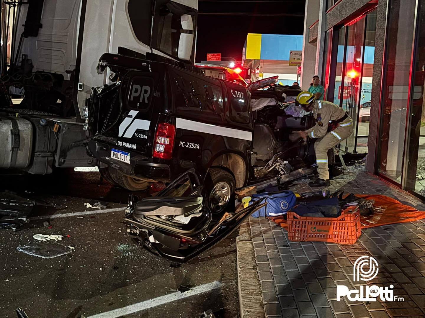 Um grave acidente foi registrado na madrugada desta terça-feira (4), por volta das 2h45, na área central de Coronel Vivida. A colisão envolveu uma viatura da Polícia Civil e um caminhão, no cruzamento das ruas Clevelândia e Major Estevão Ribeiro do Nascimento.