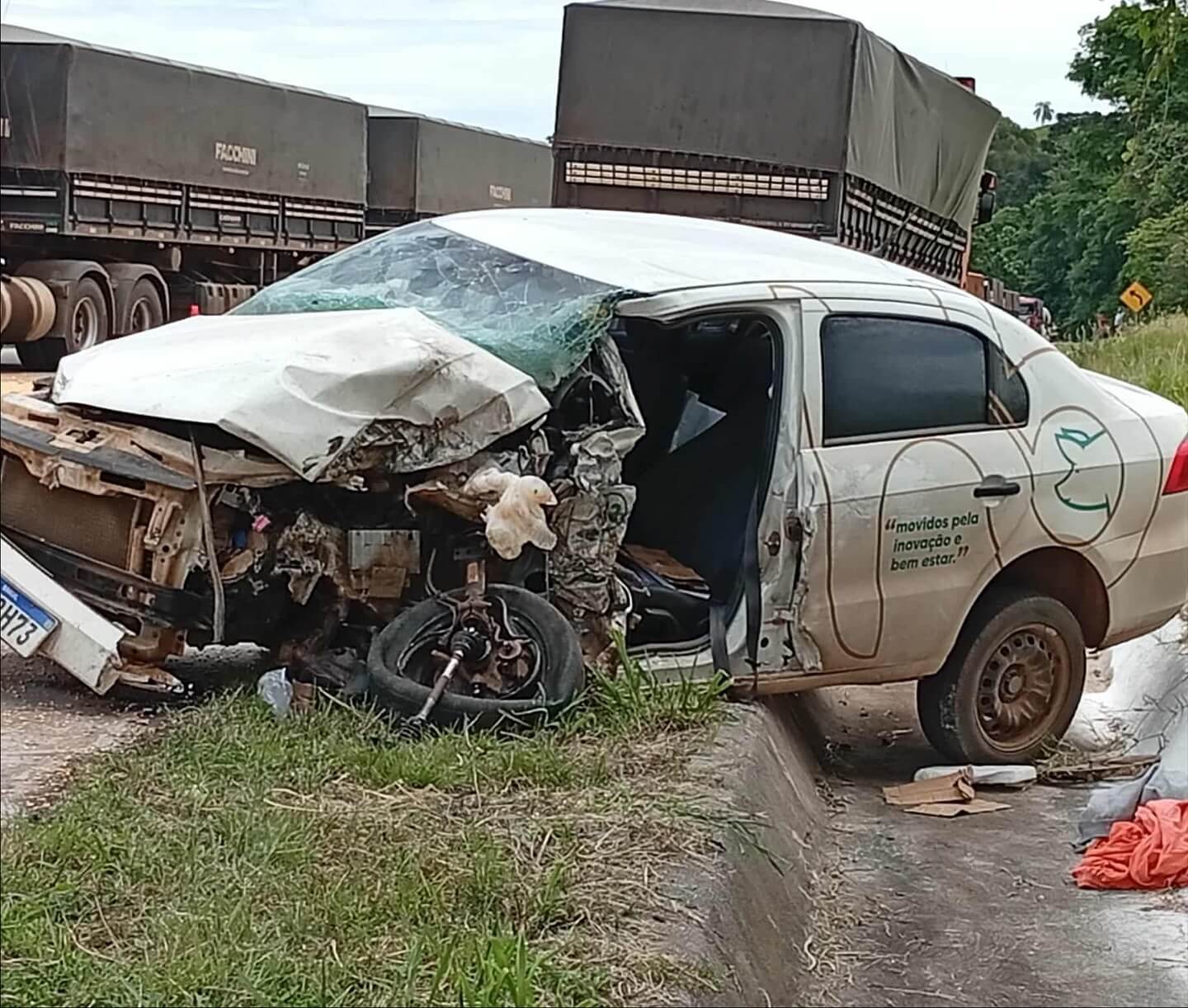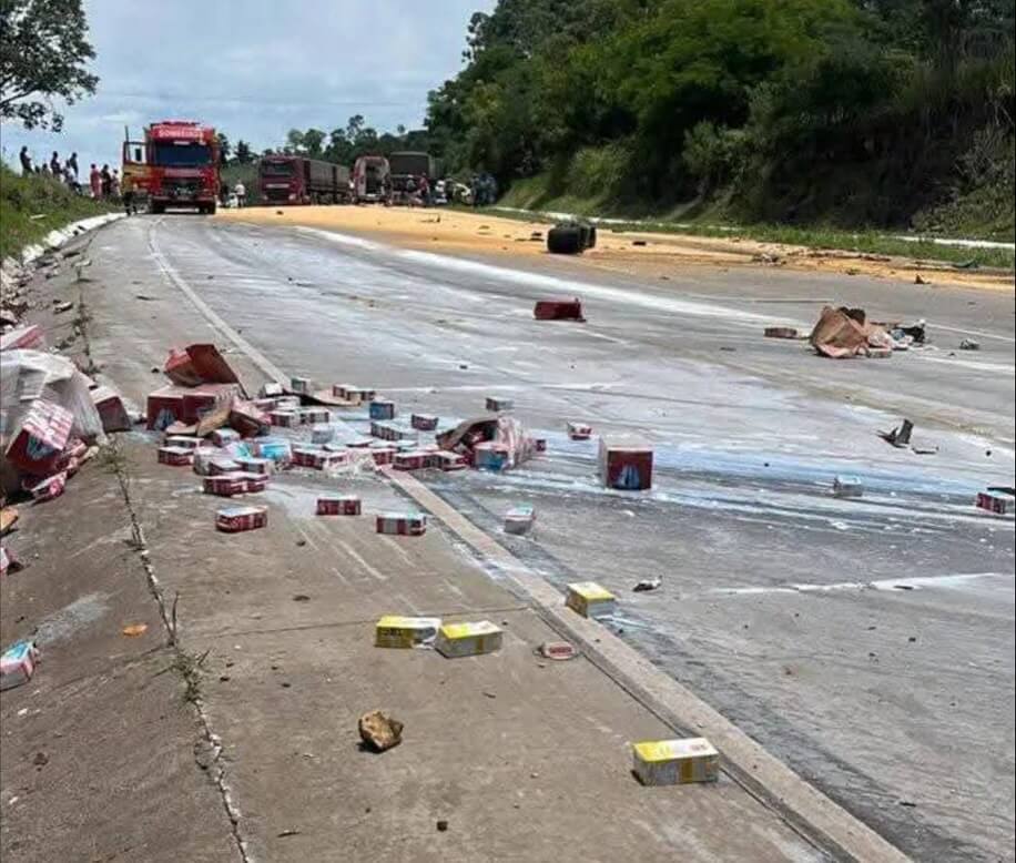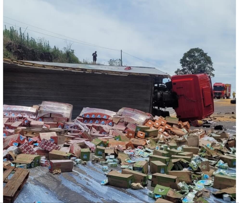 Duas pessoas ficaram feridas em um grave acidente envolvendo dois caminhões e um carro, por volta das 12h30 desta quarta-feira (5), na BR-163, entre São José do Cedro e Guaraciaba. De acordo com o Corpo de Bombeiros, a colisão envolveu uma carreta Scania carregada com milho, um caminhão Mercedes Atego que transportava caixas de leite e um automóvel Voyage. Com o impacto, os veículos de carga tombaram, bloqueando totalmente a rodovia.