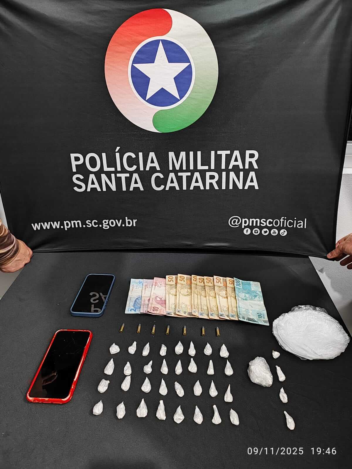 Durante as buscas, os policiais apreenderam cerca de 50g de cocaína, além de 36 buchas e outra embalagem com 15g da substância, totalizando mais de 100g, além de munição calibre .22 e dinheiro em espécie.