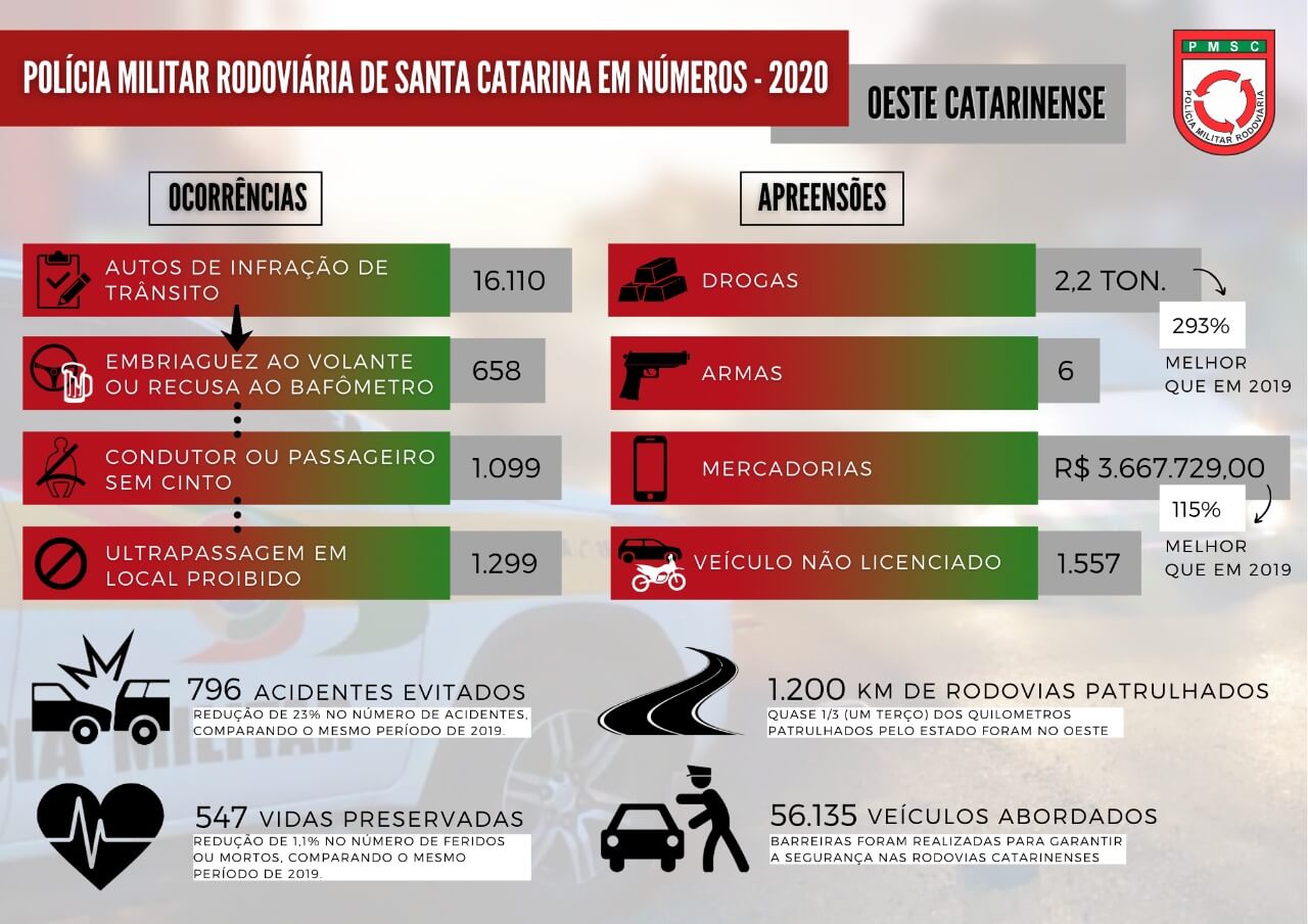 Em 2020 a Polícia Militar Rodoviária da região Oeste teve uma maior atuação na repressão ao crime, mas também reforçou a fiscalização nas infrações que geram maior perigo nas rodovias.