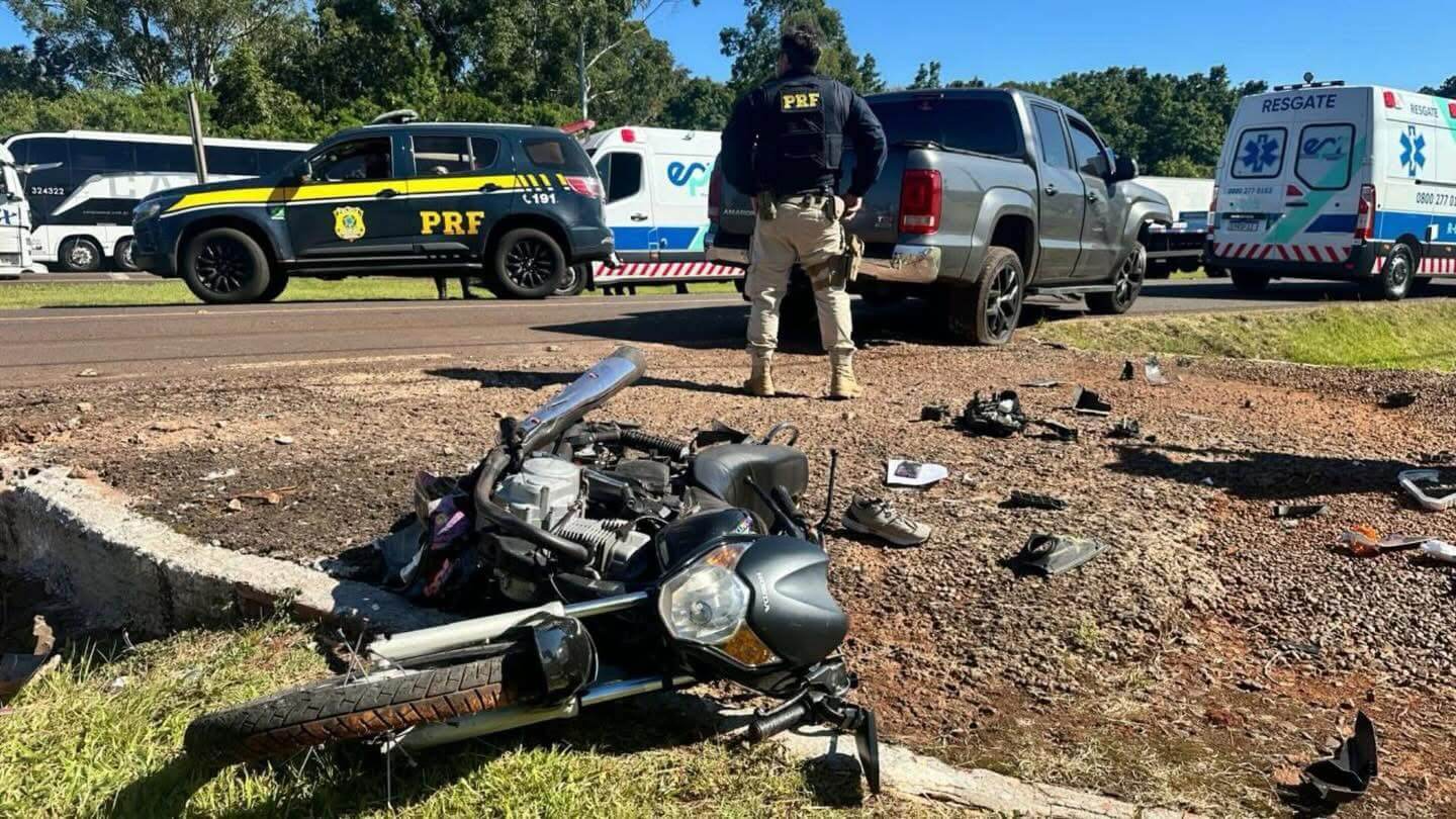 Um grave sinistro de trânsito foi registrado por volta das 8h desta quinta-feira (08) na marginal da BR-277, no bairro Turisparque, em Cascavel, no oeste do Paraná. A ocorrência, do tipo colisão traseira, foi atendida pela Polícia Rodoviária Federal (PRF). O acidente envolveu uma caminhonete e uma motocicleta que seguiam no sentido Trevo Portal. Com o impacto, o condutor da moto, um homem de 38 anos, morreu ainda no local.