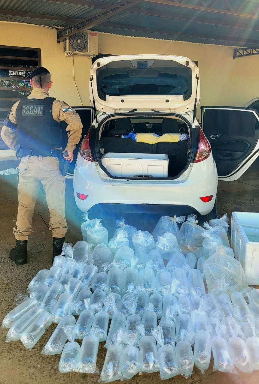 De acordo com a Rocam, a equipe fazia patrulhamento pela Avenida Arnaldo Busatto quando chamou atenção um Ford Fiesta que circulava com os vidros cobertos por tecidos escuros e com a traseira visivelmente rebaixada, indicando possível transporte de peso acima do normal. Durante a fiscalização, os policiais encontraram 96 peixes trazidos da Argentina, caracterizando contrabando de fauna. O motorista foi identificado e encaminhado para a sede da Polícia Federal juntamente com o veículo e a carga apreendida.