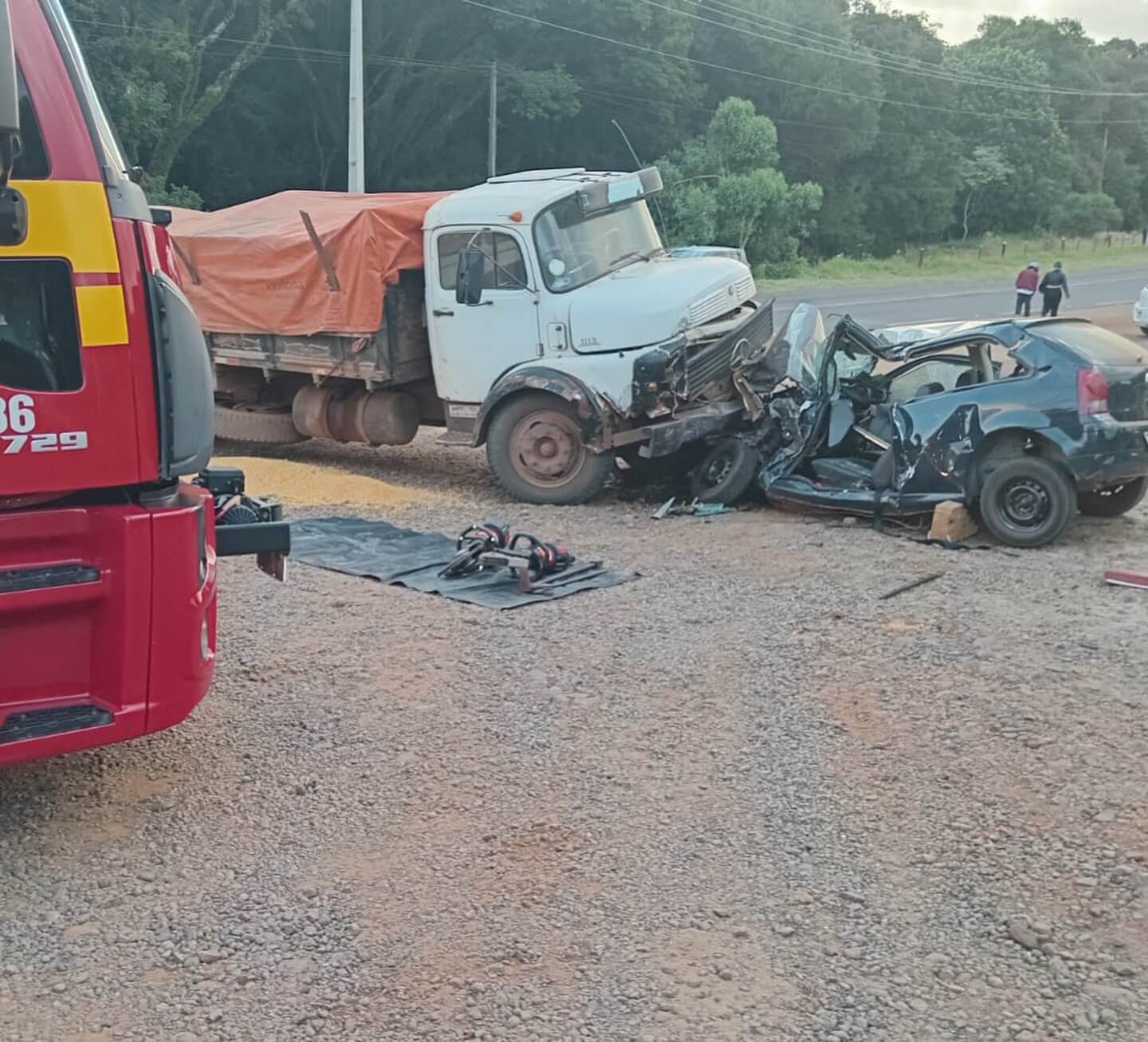 Os bombeiros abriram a porta do lado do passageiro para retirá-lo primeiro e na sequência realizaram expansão do painel para liberar o condutor. Ambos foram retirados seguindo protocolo de imobilização em ângulo controlado para evitar agravamento das lesões. O motorista foi colocado em maca rígida e conduzido à Clínica Santa Paulina para avaliação médica. O passageiro também foi encaminhado para atendimento. A pista estava seca com sinalização preservada e limite de velocidade de 60 km/h. O automóvel teve danos de grande monta e o caminhão danos de pequena monta. As circunstâncias do sinistro deverão ser apuradas pelas autoridades competentes.