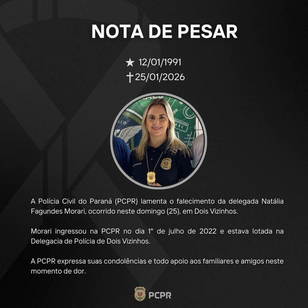 Na manhã deste domingo (25), a Polícia Civil do Paraná (PCPR) confirmou, por meio de nota oficial, a morte da delegada Natália Fagundes Morari, aos 35 anos, no município de Dois Vizinhos. Natália ingressou na PCPR em junho de 2022 e exercia suas funções na Delegacia Regional de Polícia de Dois Vizinhos, onde era reconhecida pelo profissionalismo, dedicação e compromisso com o serviço público.